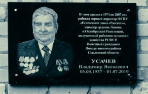 Усачев Владимир Яковлевич в 24 года возглавил совхоз «Рассвет», который был создан в 1961 году на базе нескольких колхозов. Он показал пример многим руководителям, как надо хозяйствовать на земле и приносить людям наибольшую пользу. Почти полвека было отдано сельскому хозяйству. За свою многолетнюю трудовую деятельность Владимир Яковлевич Усачев заслуженно удостоен многих наград: ордена Ленина – в 1966 году, ордена Октябрьской революции – в 1971 году, медали «За преобразование Нечерноземья» - в 1979 году, медали «За доблестный труд в ознаменовании 100-летия В.И.Ленина» - в 1970 году, медалей ВДНХ – в 1966, 1981, 1984, 1991 годах. Также ему было присвоено почетное звание «Заслуженный работник сельского хозяйства РСФСР». Особое место в этом ряду занимает почетный Знак «Отличник народного просвещения», потому что на протяжении всей своей трудовой деятельности он много сделал для укрепления материальной базы школ, расположенных в отделениях хозяйства. 1 июля 2019 года не стало В.Я.Усачева. 7 августа 2020 года на фасаде здания ОАО ПЗ «Рассвет» открыли мемориальную доску в память об этом замечательном человеке.