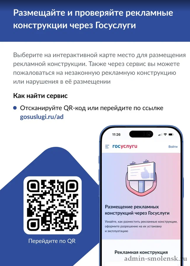 На интерактивной карте на «Госуслугах» можно увидеть все законные места, выделенные под наружные рекламные конструкции. Владельцы рекламных конструкций могут разместить на них QR-код, которые ведет на персональные страницы их конструкций на «Госуслугах» – он будет подтверждать, что они работают законно.