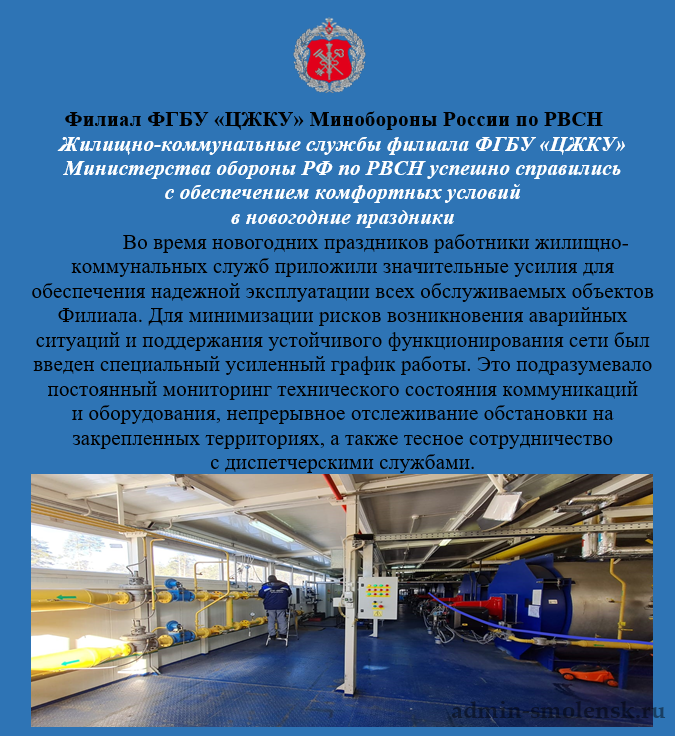 - Жилищно-коммунальные службы филиала ФГБУ «ЦЖКУ» Министерства обороны РФ по РВСН успешно справились с обеспечением комфортных условий в новогодние праздники